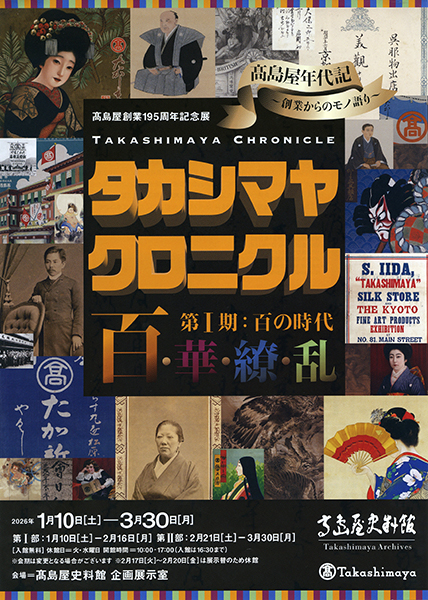 https://www.kyoto-minpo.net/event/wp-content/uploads/2026/01/20260110-06.jpghttps://www.kyoto-minpo.net/event/wp-content/uploads/2026/01/20260110-06-150x150.jpgkyomin-minpo美術館1月10日(土)~3月30日(月)【第Ⅰ部】1月10日(土)~2月16日(月)・【第Ⅱ部】2月21日(土)~3月30日(月)、10時~17時(火水曜・2月17日~2月20日、休館。入館は16時半まで)、髙島屋史料館 企画展示室 (大阪市浪速区日本橋3-5-25 高島屋東別館3F。近鉄・大阪メトロ「日本橋」駅5・10番出口より徒歩約8分)TEL06・6632・9102。 高島屋の歴史は、1831(天保2)年正月、初代飯田新七が京都・烏丸松原の地に古着木綿商「高島屋」を創業したことに始まります。2026年は⾼島屋創業195周年にあたります。高島屋史料館では、創業以来の史料や美術品、呉服、広告宣伝物など、高島屋の歴史と共に蓄積されてきた多種多彩な品々を収蔵しています。2026年は高島屋195年のモノ語りをⅠ期からⅣ期にかけて紹介します。 無料。 問い合わせTEL06・6632・9102(高島屋史料館直通)。 【関連イベント】滋賀県伝統⼯芸品「彦根繍(ひこねぬい)」ワークショップ/1月25日(日)①10時半~②13時~③15時~、同館多目的ルーム講師=⻘⽊恒雄(有限会社⻘⽊刺繍 代表取締役)・中辻由美⼦‧秋⼭智⼦(同社 繍師)要申し込み こちら 締め切り1月16日※各回定員4人 講演会「⾼島屋創業からの物語」/3月8日(日)13時~14時半、同館多目的ルーム講師=⾼井多佳⼦(⾼島屋史料館 研究員)要申し込み こちら 締め切り2月21日※定員20人 学芸員によるギャラリ―ト―ク/会期中の第1・第3土曜日 14時~。※約30分※申込不要。開始時間までに企画展示室に集合ください※状況により、イベントを休止する場合あり京都のイベントの最新情報がわかる京都イベントナビ