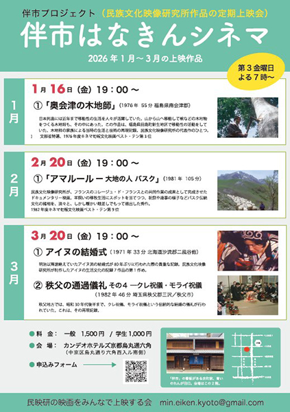 https://www.kyoto-minpo.net/event/wp-content/uploads/2025/12/20260116-01.jpghttps://www.kyoto-minpo.net/event/wp-content/uploads/2025/12/20260116-01-150x150.jpgkyomin-minpo映画映画上映会1月16日(金)19時~20時半頃、カンデオホテルズ京都烏丸六角2Fライブラリー(京都市中京区骨屋町149。地下鉄「烏丸御池」より徒歩3分。Pなし)TEL075・366・2377。※ご来場の際は公共の交通機関をご利用ください 『奥会津の木地師』(1976年/55分/福島県南会津郡)  日本列島には近年まで移動性の生活をする人々が活躍していた。山から山へ移動して椀などをつくる木地師もその中にある。福島県田島町針生地区で移動性の活動をしていた木地師の家族による当時の生活と技術の再現記録。 一般1500円、学生1000円。※ワンドリンク付き※中学生以下・カンデオホテル宿泊者、無料※定員12人※上映後は参加自由の茶話会あり 申し込みこちら 問い合わせmin.eiken.kyoto@gmail.com(民映研の映画をみんなで上映する会)。京都のイベントの最新情報がわかる京都イベントナビ