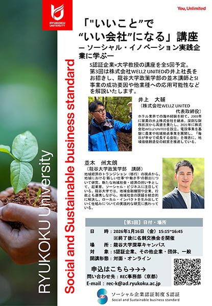 https://www.kyoto-minpo.net/event/archives/2026/01/16/post-91291.phphttps://www.kyoto-minpo.net/event/wp-content/uploads/2025/12/20260116-02.jpghttps://www.kyoto-minpo.net/event/wp-content/uploads/2025/12/20260116-02-150x150.jpg講座1月16日(金)15時15分~16時45分、龍谷大学深草キャンパス(京都市伏見区深草塚本町67。京阪本線「龍谷大前深草」駅下車、西へ徒歩約3分)TEL075・645・2098。 社会人の方を対象に、社会的価値と経済的価値を両立する「ソーシャル・イノベーション(SI)」の実践から学ぶリスキリング講座を開催します。S認証企業と大学教授による全5回のシリーズ講座として、地域社会における新たな価値創造のヒントを探ります。 株式会社WELLZ UNITEDの井上社長をお招きし、龍谷大学政策学部の並木講師とSI事業の成功要因や他業種への応用可能性などを解説します。実践事例と理論の両面から、社会課題解決型ビジネスの本質を深掘りします。※講座終了後には、登壇者や参加者同士の交流を目的とした名刺交換会予定 対面受講・オンライン受講。 無料。 チケット取り扱い こちら 問い合わせ ✉rec-l@ad.ryukoku.ac.jp(REC事務部)。kyomin-minpo seinen@kyoto-minpo.comAdministrator京都イベントなびスポンサーリンク