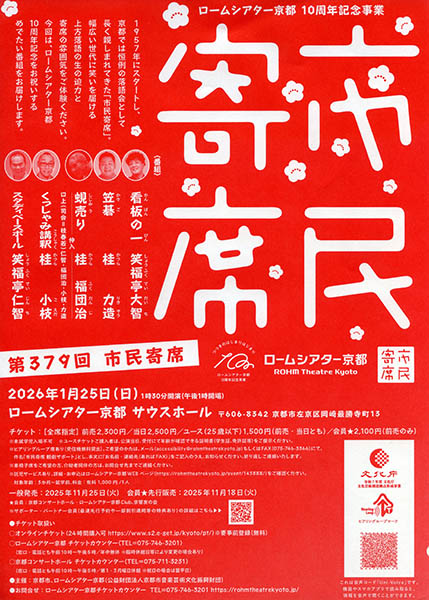 https://www.kyoto-minpo.net/event/wp-content/uploads/2026/01/20260125-01.jpghttps://www.kyoto-minpo.net/event/wp-content/uploads/2026/01/20260125-01-150x150.jpgkyomin-minpo落語1月25日(日)13時半開演(13時開場)、ロームシアター京都サウスホール(京都市左京区岡崎最勝寺町13。市バス「岡崎公園ロームシアター京都・みやこめっせ前」下車すぐ。Pなし)TEL075・771・6051。※ご来場の際には、公共交通機関をご利用下さい。 「看板の一」笑福亭大智、「笠碁」桂力造、「蜆売り」桂福団治、口上(司会:桂春若)笑福亭仁智・桂福団治・桂小枝・桂力造、「くっしゃみ講釈」桂小枝、「スタディベースボール」笑福亭仁智 一般2500円(前売り2300円)、ユース(25歳以下)1500円。※全席指定※未就学児入場不可(託児サービスあり/3ヶ月~就学前対象、1000円 要予約こちら)※ユースチケットは公演当日に要証明書提示※ヒアリンググループ席(専用受信機無料貸出)希望の方、✉accessibility@rohmtheatrekyoto.jpかFAX075・746・3366に、件名「市民寄席 観劇サポート」とし、本文に「名前・連絡先・観劇人数」を記入し、お知らせください※車椅子席希望者・介助者同伴の方、要問い合わせTEL075・746・3201 申し込み・問い合わせTEL075・746・3201(ロームシアター京都チケットカウンター/10時~17時)ほか。京都のイベントの最新情報がわかる京都イベントナビ