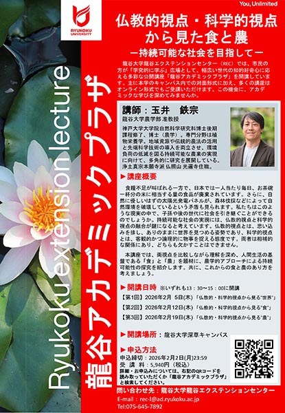 https://www.kyoto-minpo.net/event/wp-content/uploads/2025/12/20260205-01.jpghttps://www.kyoto-minpo.net/event/wp-content/uploads/2025/12/20260205-01-150x150.jpgkyomin-minpo講座2月5日(木)・2月12日(木)・2月19日(木)、龍谷大学深草キャンパス(京都市伏見区深草塚本町67。京阪本線「龍谷大前深草」駅下車、西へ徒歩約3分)TEL075・645・7892。  食糧不足が叫ばれる一方で、日本では一人当たり毎日、お茶碗一杯分の米に相当する量の食品が廃棄されています。さらに、自然に優しいはずの太陽光発電パネルが、森林伐採などによって自然環境を破壊しているという矛盾も見られます。私たちはこのような現実の中で、子孫や後の世代に社会を引き継ぐことができるのでしょうか。持続可能な社会の実現には、仏教的視点と科学的視点の融合が鍵になると考えています。仏教的視点とは、思い込みを排し、ありのままに世界を見つめる姿勢であり、科学的視点とは、客観的かつ論理的に物事を捉える態度です。両者は相補的な関係にあり、どちらも欠かすことはできません。 同講座では、両視点を比較しながら理解を深め、人間生活の基盤である「食」と「農」を題材に、農学的アプローチによる持続可能性の探究を紹介します。 講師=玉井鉄宗(龍谷大学農学部 准教授) ●第1回/2月5日(木)(13時半~15時)「仏教的視点・科学的視点から見る『世界』」●第2回/2月12日(木)(13時半~15時)「仏教的視点・科学的視点から見る『食』」●第3回/2月19日(木)(13時半~15時)「仏教的視点・科学的視点から見る『農』」 対面受講・オンライン受講/5940円(全3回)。 チケット取り扱い こちら ※2月2日(月)23時59分、締め切り問い合わせTEL075・645・7892(平日9時~17時)、✉rec-l@ad.ryukoku.ac.jp(龍谷大学龍谷エクステンションセンター)。京都のイベントの最新情報がわかる京都イベントナビ