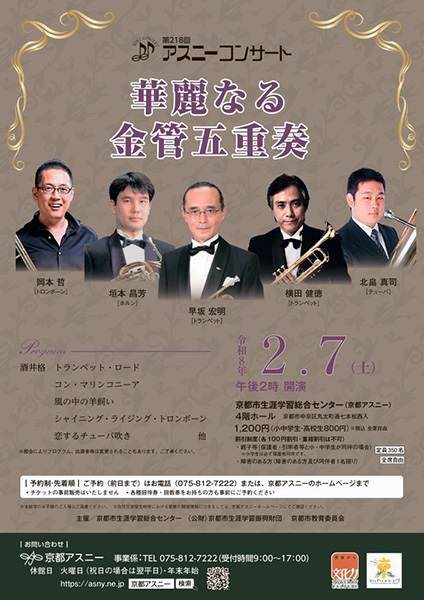 https://www.kyoto-minpo.net/event/archives/2026/02/07/post-91451.phphttps://www.kyoto-minpo.net/event/wp-content/uploads/2026/01/20260207-04.jpghttps://www.kyoto-minpo.net/event/wp-content/uploads/2026/01/20260207-04-150x150.jpg音楽2月7日(土)14時開演、京都生涯学習総合センター(京都アスニー)4Fホール(京都市中京区丸太町通七本松西入ル。市バス「丸太町七本松」または「京都アスニー前」下車。有料Pあり)TEL075・812・7222。※ご来場の際は公共交通機関をご利用ください 出演=早坂宏明(トランペット)、横田健徳(トランペット)、垣本昌芳(ホルン)、岡本哲(トロンボーン)、北畠真司(テューバ) プログラム=酒井格/トランペット・ロード、コン・マリンコニーア、風の中の羊飼い、シャイニング・ライジング・トロンボーン、恋するチューバ吹き ほか 一般1200円、高中小生800円※要予約※全席自由※未就学児入場不可※親子(保護者・引率者と中小生が同伴の場合)・障がい者とその同伴者1人、割引あり※定員350人 チケット取り扱いWEB申込みフォーム 問い合わせTEL075・812・7222(京都アスニー事務係/受付9時~17時。火曜休、ただし祝日の場合は翌平日休)。kyomin-minpo seinen@kyoto-minpo.comAdministrator京都イベントなびスポンサーリンク
