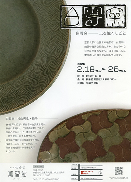 https://www.kyoto-minpo.net/event/wp-content/uploads/2026/01/20260219-02.jpghttps://www.kyoto-minpo.net/event/wp-content/uploads/2026/01/20260219-02-150x150.jpgkyomin-minpo画廊・ギャラリー2月19日(木)~2月25日(水)10時~17時(不定休)、松栄堂薫習館 1F松吟ロビー(京都市中京区烏丸通二条上ル東側。地下鉄烏丸線「丸太町」7番出口徒歩3分)TEL075・212・5590。 京都北部に位置する綾部市。白雲窯は綾部の簡素な里山にあり、おだやかな自然に囲まれながら、日々の暮らしに寄り添った器を生み出しています 無料。 問い合わせTEL075・212・5590(松栄堂 薫習館)。京都のイベントの最新情報がわかる京都イベントナビ