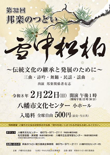 https://www.kyoto-minpo.net/event/archives/2026/02/22/post-91545.phphttps://www.kyoto-minpo.net/event/wp-content/uploads/2026/01/20260222-01.jpghttps://www.kyoto-minpo.net/event/wp-content/uploads/2026/01/20260222-01-150x150.jpg音楽2月22日(日)13時開演(12時半開場)、八幡市文化センター 小ホール(京都府八幡市八幡高畑5-3。京阪バス「八幡市役所」下車すぐ)TEL075・971・2111。 ~伝統文化の継承と発展のために~三曲・詩吟・舞踊・民謡・謡曲 出演=邦楽関係者有志 【同時開催】八幡市文化協会短歌部会作品展「雪中松柏」 500円。※全席自由 問い合わせTEL075・971・2111(〔八幡市文化センター内〕邦楽のつどい実行委員会事務局)。kyomin-minpo seinen@kyoto-minpo.comAdministrator京都イベントなびスポンサーリンク