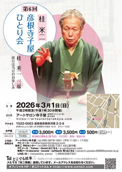 https://www.kyoto-minpo.net/event/archives/2026/03/01/post-92166.phphttps://www.kyoto-minpo.net/event/wp-content/uploads/2026/02/20260301-02.jpghttps://www.kyoto-minpo.net/event/wp-content/uploads/2026/02/20260301-02-150x150.jpg落語3月1日(日)14時開演(13時半開場)、アートサロン寺子屋(滋賀県彦根市河原2丁目3-6。JR「彦根」駅より徒歩15分)TEL0749 ・22・1601。 出演=桂米二(三席)演目=当日のお楽しみ※お茶・お菓子付き 一般3500円(前売り3000円)、ユース(25歳以下)500円。※板間席(クッション有)・椅子席※限定40席※ユースは限定5席、要予約、要年齢証明※終演後懇親会あり(3000円。要予約。飲み物・軽食付き) 申し込み・問い合わせTEL090 ・3679・1601(アートサロン寺子屋/平日11時~17時)、TEL080 ・5338・7331(桂米二予約センター)ほか。kyomin-minpo seinen@kyoto-minpo.comAdministrator京都イベントなびスポンサーリンク