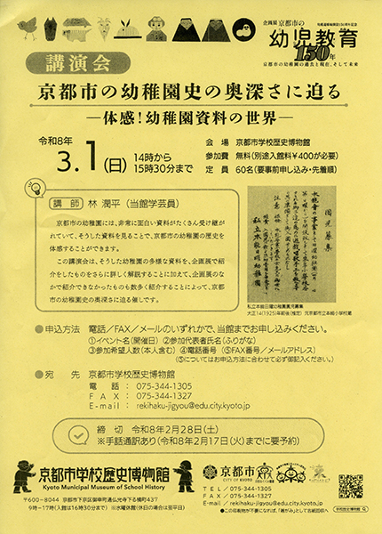 https://www.kyoto-minpo.net/event/archives/2026/03/01/post-92368.phphttps://www.kyoto-minpo.net/event/wp-content/uploads/2026/02/20260301-03.jpghttps://www.kyoto-minpo.net/event/wp-content/uploads/2026/02/20260301-03-150x150.jpg講座3月1日(日)14時~15時半、京都市学校歴史博物館(京都市下京区御幸町通仏光寺下ル橘町437。阪急京都線「河原町」10番出口より徒歩10分、または地下鉄烏丸線「四条」5番出口より東へ徒歩12分。Pなし)TEL075・344・1305。※ご来場の際は公共交通機関をご利用下さい 京都市の幼稚園には、非常に面白い資料がたくさん受け継がれていて、そうした資料を見ることで、京都市の幼稚園の歴史を体感することができます。展示資料や未公開の資料を用いて京都の幼稚園の歴史を深掘りする。 講師=林潤平(同館学芸員) 無料。※要入館(400円)※要予約(先着順)※定員60人 申し込み方法/①イベント名(開催日)、②参加代表者氏名(ふりがな)、③参加希望人数(本人を含む)、④電話番号(申込方法に合わせてFAX番号・メールアドレス)、を明記し、TEL075・344・1305(9時~17時、水休)、FAX075・344・1327、✉rekihaku-jigyou@edu.city.kyoto.jp のいずれかで申し込み。申し込みは2月28日(土)まで 問い合わせTEL075・344・1305/FAX075・344・1327(京都市学校歴史博物館/9時~17時。水曜休、但し休日の場合翌平日休)kyomin-minpo seinen@kyoto-minpo.comAdministrator京都イベントなびスポンサーリンク