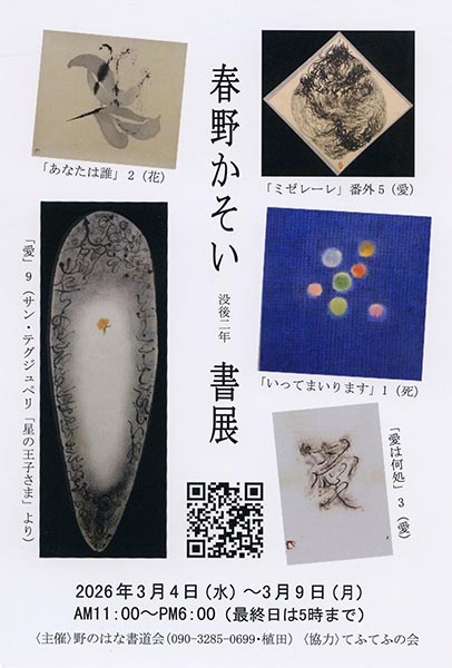 https://www.kyoto-minpo.net/event/wp-content/uploads/2026/02/20260304-01.jpghttps://www.kyoto-minpo.net/event/wp-content/uploads/2026/02/20260304-01-150x150.jpgkyomin-minpo画廊・ギャラリー3月4日(水)~3月9日(月)11時~18時(最終日17時まで)、アートギャラリー北野(京都市中京区三条通河原町東入ル恵比須町439-4 コーカビル。地下鉄東西線「京都市役所前」より徒歩5分。Pなし)TEL075・221・5397。※ご来場の際は公共交通機関をご利用ください 主催=野のはな書道会 問い合わせTEL075・221・5397。 春野かそい 京都のイベントの最新情報がわかる京都イベントナビ
