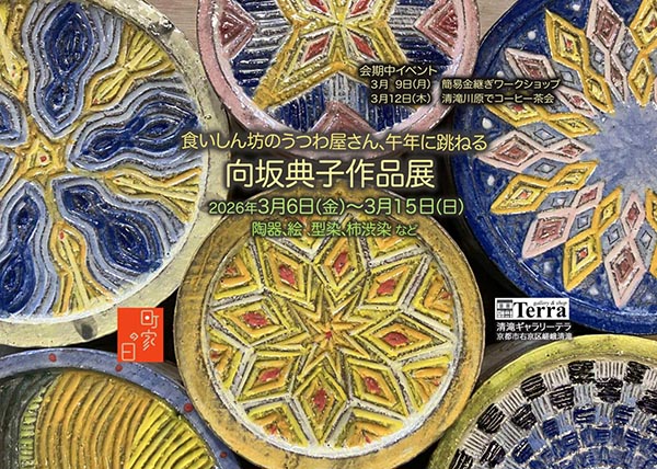 https://www.kyoto-minpo.net/event/wp-content/uploads/2026/02/20260306-02.jpghttps://www.kyoto-minpo.net/event/wp-content/uploads/2026/02/20260306-02-150x150.jpgkyomin-minpo画廊・ギャラリー3月6日(金)~3月15日(日)11時~17時(最終日16時まで)、清滝ギャラリーテラ(京都市右京区嵯峨清滝11-2。京都バス「清滝」下車徒歩5分)TEL075・204・8122。 若狭に暮らす陶芸家の向坂さんは、一から十までのものづくり名人です。暮らしの中から生まれた作品が並びます。※町家 week 3月7日~3月15日 問い合わせTEL/FAX075・204・8122(テラ)、TEL090・5655・4568(会期中/テラ:小林)。 【関連イベント】●簡易金継ぎワークショップ/3月9日(月)13時半~15時欠け、ヒビ割れの器を持参し人口漆で修復(一人3点まで)2000円。※要予約※上記以外の日も可能(要予約)●清滝川原でコーヒー茶会/3月12日(木)13時半~15時半展示作品からカップを選び、清滝川原で自家焙煎して茶会4000円(コーヒー・スイーツ・コーヒーカップ付き)※要予約※選んだ器は持ち帰り可※雨天時は室内にて開催京都のイベントの最新情報がわかる京都イベントナビ