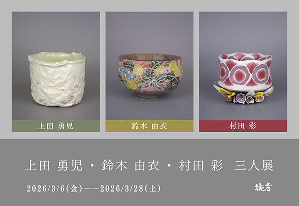 https://www.kyoto-minpo.net/event/archives/2026/03/06/post-92360.phphttps://www.kyoto-minpo.net/event/wp-content/uploads/2026/03/20260306-03.jpghttps://www.kyoto-minpo.net/event/wp-content/uploads/2026/03/20260306-03-150x150.jpg画廊・ギャラリー3月6日(金)~3月28日(土)11時~18時(日・月曜休。最終日16時まで)、桃青京都ギャラリー(京都市中京区一之舟入町375 SSSビル1F。地下鉄東西線「京都市役所前」直結、ゼスト御池16番出口より徒歩3分。Pなし。周辺有料Pあり)TEL075・585・5696。 同展のメインテーマは「抹茶碗」。上田勇児、鈴木由衣の2名は、これまで主にコンテンポラリーアートとしての陶表現を追求してきた作家であり、抹茶碗の制作は同展が初の試みとなります。一方、村田彩はこれまでも器と造形の両面から陶芸表現を深めてきた作家であり、同展では新たな抹茶碗の表現を提示します。3名すべての抹茶碗は同展のために制作された新作です。 抹茶碗という、日本文化と精神性を象徴するかたちに、信楽の土と炎、そしてそれぞれの作家の美意識がどのように立ち現れるのか。伝統的な器でありながら、完成された形式にとどまらない、現代ならではの解釈と実験性が同展の大きな見どころです。 会場には抹茶碗のほか、オブジェ、壺、皿なども並び、各作家の多様な表現を包括的に紹介します。素材への鋭い感覚、造形への探究心、そして信楽という土地に根ざしながら世界へと開かれた視点が交差する展示空間となるでしょう。 桃青京都ギャラリー 【作品の販売についてのご案内】作品の販売/3月6日(金)〜3月12日(木)は店頭販売のみオンライン販売/3月13日、11時~オンラインでの購入を希望の方は、メール(info@gallerytosei.com)またはInstagram DM(@toseikyotogallery)まで要連絡。※先着順の案内 問い合わせinfogallerytosei.com(桃青京都ギャラリー)。kyomin-minpo seinen@kyoto-minpo.comAdministrator京都イベントなびスポンサーリンク