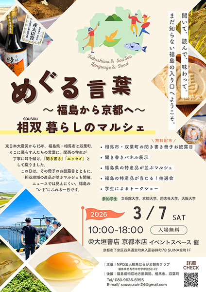 ●福島のおいしい特産品が並ぶマルシェ/福島産のあおさ・お米・お醤油・お味噌・銘菓・オリジナルクッキー・珈琲・タオル・小物 ほか●冊子『めぐる言葉』 無料配布●学生によるトークショー/①11時②13時半③16時(各回20分)/立命館大学・京都大学・同志社大学・大阪大学の学生たちが、取材を通して感じた福島の暮らしや出会いを語ります。トークショー後には福島クイズも実施!正解者には抽選券のプレゼントも。