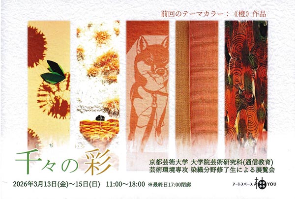 3月13日(金)~3月15日(日)11時~18時(最終日17時まで)、アートスペース柚YOU(京都市左京区北門前町487-5。地下鉄東西線「東山」より東大路通を北へ徒歩7分)TEL090・6916・5353。