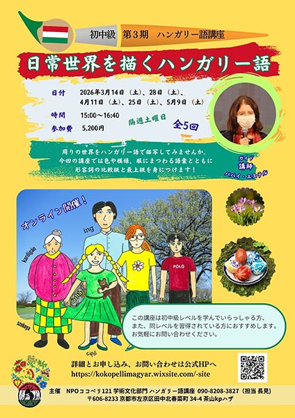 https://www.kyoto-minpo.net/event/wp-content/uploads/2026/01/20260314-02.jpghttps://www.kyoto-minpo.net/event/wp-content/uploads/2026/01/20260314-02-150x150.jpgkyomin-minpo講座3月14日(土)・3月28日(土)・4月11日(土)・4月25日(土)・5月9日(土)、15時~16時40分(14時50分頃よりオンライン入室受付)、オンランでの開催。 この講座では語学の楽しい旅に出かけ、周りの世界をハンガリー語で描写できるようになります!色や模様、服の名前を次々と身につけ、形容詞の比較級と最上級にまで手を伸ばしてみましょう! 家族旅行の懐かしい集合写真。色彩に溢れる風景。青い目をしている小さい男の子が茶髪の女の子の隣に立っています。「あの時はまだお姉ちゃんの方が背が高かったな……お母さんのあの花模様のドレスも懐かしい…どこに行ったんだろう?お父さんが慣れないアイロンがけをしたときに焦がしてしまったのかも。それとも、焦がしたのはぼくだっけ…?」 写真を眺めながら、目に見える情景を初めてハンガリー語で表現してみます…それは世界を言葉にする語学の旅。 講師=パパイ・エステル 〔サポート内容〕・講座の録画を一定期間提供・宿題の提供と添削・各回の後にリアルタイムでの質疑応答あり(自由参加) 5200円(全5回)。※これまでに同講座、イベントに参加された事のある人は5000円※「オンタイム声出し参加可能な方」対象の講座※初中級レベルを学んでいる⽅、同レベルを習得されている⽅におすすめ※レベルにご不安な方で参加希望の方は要問い合わせ。講座レベルについての詳細※講座資料は、講座の2日~1日前に送ります※中学生以下の方・障がい者とその介助人は3人まで無料。申し込みフォーム備考欄に要記入※年齢に関係なく、経済的に何かありましたら、要問合せ チケット取り扱い WEB申し込みフォーム ※3月13日(金)昼12時、締め切り 問い合わせ✉kokopelli.magyar@gmail.com(ハンガリー語講座、担当:星子、エステル)、TEL090・8208・3827(NPOココペリ121学術文化部門、担当:長見)。京都のイベントの最新情報がわかる京都イベントナビ