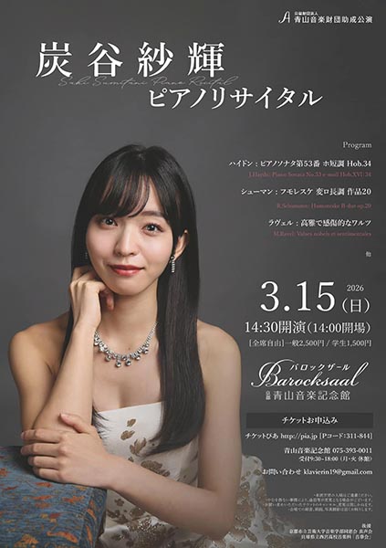 https://www.kyoto-minpo.net/event/archives/2026/03/15/post-91994.phphttps://www.kyoto-minpo.net/event/wp-content/uploads/2026/02/20260315_03.jpghttps://www.kyoto-minpo.net/event/wp-content/uploads/2026/02/20260315_03-150x150.jpg音楽3月15日(日)14時半開演(14時開場)、青山音楽記念館バロックザール(京都市西京区松尾大利町9-1。阪急嵐山線「上桂」より西へ300メートル。Pなし)TEL075・393・0011。※ご来場の際は公共交通機関をご利用ください 出演=炭谷紗輝(ピアノ)プログラム=ハイドン/ピアノソナタ第53番 ホ短調 Hob.ⅩⅥ:34、シューマン/フモレスケ 変ロ長調 作品20、ラヴェル/高雅で感傷的なワルツ 他 一般2500円、学生1500円。※全席自由※未就学児入場不可 チケット取り扱い TEL075・393・0011(青山音楽記念館/9時半~18時。月・火、休)ほか 問い合わせklavierin19gmail.comkyomin-minpo seinen@kyoto-minpo.comAdministrator京都イベントなびスポンサーリンク