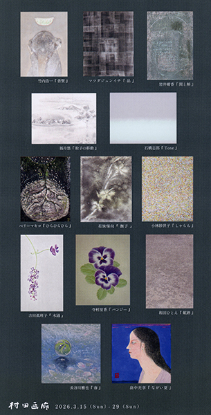 3月15日(日)~3月29日(日)10時~18時、村田画廊(京都市左京区松ヶ崎泉川町18-4。市バス「東北園町」下車徒歩2分、地下鉄烏丸線「松ヶ崎」より徒歩約8分)TEL075・703・8960。