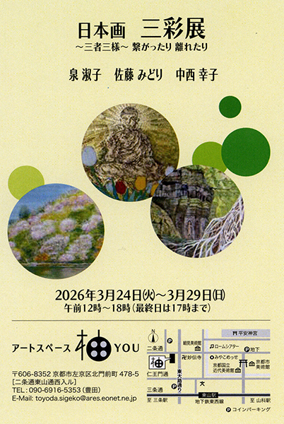 3月24日(火)~3月29日(日)12時~18時(月曜休。最終日17時まで)、アートスペース柚YOU(京都市左京区北門前町487-5。地下鉄東西線「東山」より東大路通を北へ徒歩7分)TEL090・6916・5353。