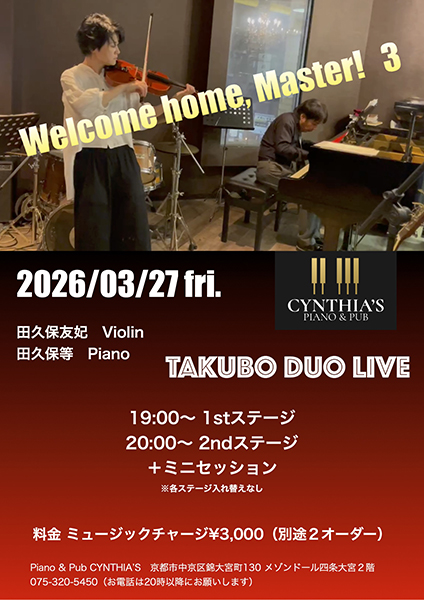 https://www.kyoto-minpo.net/event/archives/2026/03/27/takubo-duo-live.phphttps://www.kyoto-minpo.net/event/wp-content/uploads/2026/01/20260327-01.jpghttps://www.kyoto-minpo.net/event/wp-content/uploads/2026/01/20260327-01-150x150.jpg音楽3月27日(金)19時開演(18時半開場)、PIANO & PUB CYNTHIA'S (京都府京都市中京区錦大宮町130 メゾンドール四条大宮 2F。阪急・嵐電「大宮」駅から徒歩3分)TEL075・320・5450。 出演=田久保友妃(ヴァイオリン)・田久保等(ピアノ) 1stステージ/19時~2ndステージ/20時~+ミニセッション※入れ替えなし ミュージックチャージ3000円+2オーダー制 申し込み・問い合わせTEL075・320・5450(PIANO & PUB CYNTHIA'S/20時~)。kyomin-minpo seinen@kyoto-minpo.comAdministrator京都イベントなびスポンサーリンク