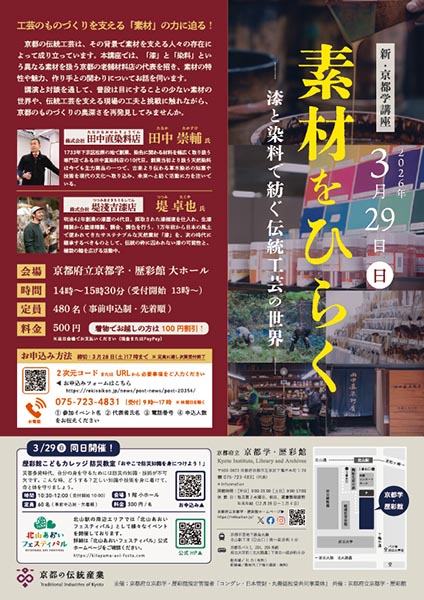 https://www.kyoto-minpo.net/event/archives/2026/03/29/post-92327.phphttps://www.kyoto-minpo.net/event/wp-content/uploads/2026/02/20260329-02.jpghttps://www.kyoto-minpo.net/event/wp-content/uploads/2026/02/20260329-02-150x150.jpg講座3月29日(日)14時~15時半(13時より受付開始)、京都府立京都学・歴彩館1F大ホール(京都府京都市左京区下鴨半木町1−29。地下鉄烏丸線「北山」1番出口より南へ徒歩4分。有料Pあり)TEL075・723・4831。※ご来場の際は公共の交通機関をご利用ください 京都の伝統工芸は、その背景で素材を支える人々の存在によって成り立っています。同講座では、「漆」と「染料」という異なる素材を扱う京都の老舗材料店の代表を招き、素材の特性や魅力、作り手との関わりについてお話を伺います。講演と対談を通して、普段は目にすることの少ない素材の世界や、伝統工芸を支える現場の工夫と挑戦に触れながら、京都のものづくりの奥深さを再発見してみませんか。 講師=田中 崇輔(田中直染料店 取締役社長)、堤 卓也(㈱堤淺吉漆店代表) 500円。※当日、着物でお越しの方は、参加料金より100円割引※当日会場にてお支払い※定員=480人※要予約・先着順 チケット取り扱い こちら ほか、※締め切り3月28日(土)17時まで 問い合わせTEL075・723・4831(京都府立京都学・歴彩館指定管理者「コングレ・日本管財・丸善雄松堂共同事業体」/9時~17時、但し休館日除く)。kyomin-minpo seinen@kyoto-minpo.comAdministrator京都イベントなびスポンサーリンク