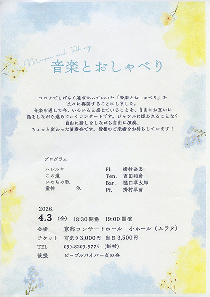 https://www.kyoto-minpo.net/event/archives/2026/04/03/post-92895.phphttps://www.kyoto-minpo.net/event/wp-content/uploads/2026/04/20260403-02.jpghttps://www.kyoto-minpo.net/event/wp-content/uploads/2026/04/20260403-02-150x150.jpg音楽京都コンサートホール4月3日(金)19時開演(18時半開場)、京都コンサートホール 小ホール(京都市左京区下鴨半木町1-26。地下鉄烏丸線「北山」1番出口より南へ徒歩5分。有料Pあり)TEL075・711・2980(代)。 出演=掛村岳志、吉田和彦、樋口草太朗、掛村早苗プログラム=ハレルヤ、この道、いのちの歌、童神 ほか 一般3500円(3000円)。※全席自由 申し込み・問い合わせTEL090・8203・9774(掛村)。kyomin-minpo seinen@kyoto-minpo.comAdministrator京都イベントなびスポンサーリンク