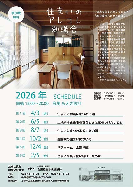 https://www.kyoto-minpo.net/event/wp-content/uploads/2026/03/20260403-05.jpghttps://www.kyoto-minpo.net/event/wp-content/uploads/2026/03/20260403-05-150x150.jpgkyomin-minpo講座4月3日(金)18時~20時、もえぎ設計(京都市上京区笹屋町通大宮西入桝屋町601番地)。TEL075・431・1120 住まいに関する色々なことを一緒に学んでいこう、という趣旨のもと「住まいのアレコレ勉強会」という企画を開催してきました。これまで取り上げてきたテーマをさらにアップデートして開催します。2カ月おきの計6回連続講座。 無料 申し込み WEB申し込みフォームまたは、✉moegi@moegi-archi.comに氏名・住所・連絡先等を明記し、申し込みください 問い合わせTEL075・431・1120(企業組合もえぎ設計)。京都のイベントの最新情報がわかる京都イベントナビ