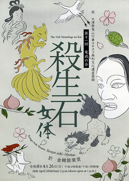 https://www.kyoto-minpo.net/event/archives/2026/04/26/post-92515.phphttps://www.kyoto-minpo.net/event/wp-content/uploads/2026/04/20260426-01.jpghttps://www.kyoto-minpo.net/event/wp-content/uploads/2026/04/20260426-01-150x150.jpg伝統4月26日(日)14時開演(13時開場) 、金剛能楽堂(京都市上京区烏丸通中立売上ル。地下鉄烏丸線「今出川」より徒歩5分。Pなし)TEL075・441・7222。 解説「大津祭と能」宇髙竜成、独調「鶴亀」宇髙徳成(謡)・古田知英(小鼓)、独鼓「西王母」宇髙竜成(謡)・前川光範(太鼓)、仕舞「西行桜」金剛永謹、居囃子「石橋」左鴻泰弘(笛)・古田知英(小鼓)・渡部論(大鼓)・前川光範(太鼓)、能「殺生石 女体」宇髙竜成 特等席(指定席)18000円、1等席(指定席)12000円、2等席(指定席)9000円、3等席(自由席)6000円、次世代シート(自由席)3000円、親子シート(自由席)7000円。 ※特等席は竜成の会オリジナルグッズ付き※次世代シート:お能を初めてご覧になる方、学生、舞台芸術を志す方※親子シート:2人分。1人追加につき3500円。6歳以上のお子様可※歌詞テキスト(現代語訳付き謡音源)あり。チケット購入後にダウンロードリンクをお知らせします チケット取り扱い WEB申し込みフォーム、TEL075・441・7222(金剛能楽堂。3等席のみ取り扱い)、✉info@tatsushigenokai.com(タツシゲの会事務局) 申し込み・問い合わせTEL075・441・7222(金剛能楽堂)kyomin-minpo seinen@kyoto-minpo.comAdministrator京都イベントなびスポンサーリンク