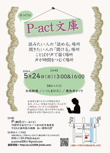 https://www.kyoto-minpo.net/event/archives/2026/05/24/post-93129.phphttps://www.kyoto-minpo.net/event/wp-content/uploads/2026/03/20260524-02.jpghttps://www.kyoto-minpo.net/event/wp-content/uploads/2026/03/20260524-02-150x150.jpg舞台5月24日(日)13時/16時開演(開場は各開演時間の30分前)、P-act(京都市上京区河原町通今出川下ル梶井町448 清和テナントハウス2F。京阪鴨東線「出町柳」より西に徒歩10分、または市バス「河原町今出川」下車すぐ。Pなし)。 読みたい人の「読める」場所。聞きたい人の「聞ける」場所。ことばが声で届く場所。声が時間をつむぐ場所。月に1回、P-actが、そんな「P-act文庫」に早変わり。毎月メニューを替えて、出演者を募り朗読公演。P-actならではの、月イチ手作り公演。 出演=大坂幹雄・いくしまひろこ・飛鳥井かゞり 500円。※要予約 申し込み・問い合わせTEL090・1139・2963、✉p.actmail0841@gmail.com(ピーアクト・飛鳥井)。kyomin-minpo seinen@kyoto-minpo.comAdministrator京都イベントなびスポンサーリンク