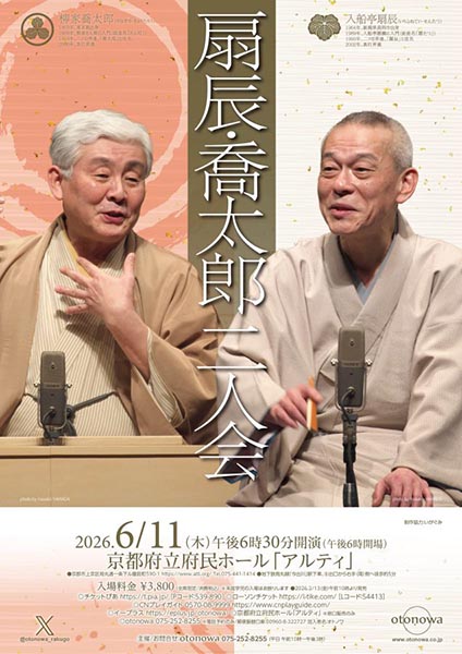 https://www.kyoto-minpo.net/event/wp-content/uploads/2026/02/20260611-01.jpghttps://www.kyoto-minpo.net/event/wp-content/uploads/2026/02/20260611-01-150x150.jpgkyomin-minpo落語6月11日(木)18時半開演(18時開場)、京都府立府民ホールアルティ(京都市上京区烏丸通一条下ル。地下鉄烏丸線「今出川」6番出口より南へ徒歩5分。Pなし)TEL075・441・1414。※ご来場の際は公共交通機関をご利用ください 同学年・同期入門、二人の人気噺家による落語会。 出演=入船亭扇辰・柳家喬太郎演目=当日のお楽しみ 3800円。※全席指定※未就学入場不可 チケット取り扱い(チケットぴあ)Pコード:539-890、(ローソンチケット)Lコード:54413 ほか。問い合わせTEL075・252・8255(otonowa/平日10時~18時)。京都のイベントの最新情報がわかる京都イベントナビ