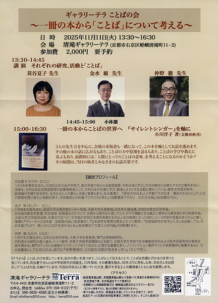 11月11日(火)13時半~16時半、清滝ギャラリーテラ(京都市右京区嵯峨清滝11-2。京都バス「清滝」下車徒歩5分)TEL075・204・8122。