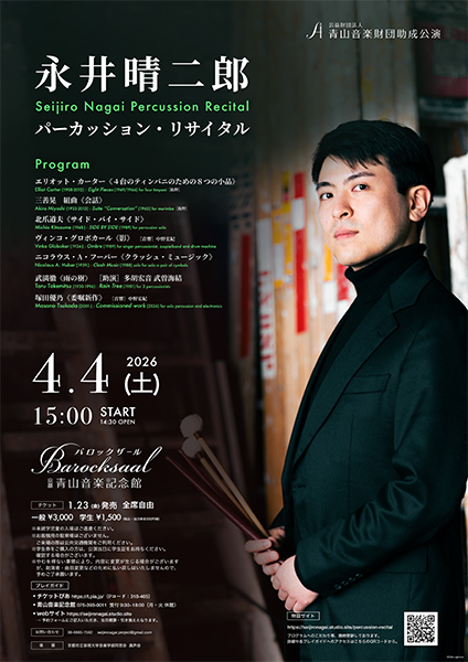 4月4日(土)15時開演(14時半開場)、青山音楽記念館バロックザール(京都市西京区松尾大利町9-1。阪急嵐山線「上桂」より西へ300メートル。Pなし)TEL075・393・0011。※ご来場の際は公共交通機関をご利用ください