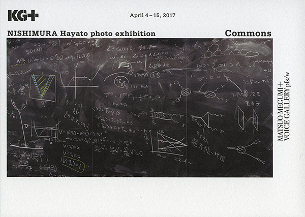 自然科学の研究現場において研究者の思考の痕跡に着目して撮影を進めている。今回の展示では、研究者がアイデアを議論し、具現化するために用いる黒板を題材とする。数式や図で満たされた黒板は、専門外の人間の理解を寄せ付けず、ある種の秘術の痕跡のように感じられるが、秘められた真理を究め、それを普遍化しようとする研究者の思考の所産にほかならない。とりわけ数学や数理的手法を用いる科学においては、そのプロセスに強く結びつく重要な基盤である。(西村勇人)