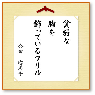 この句も昨日の卓さんと同じ「川柳・交差点」3月号の句で、課題は「貧、貧しい」です。女性作家の瑠美子さんなので、「貧弱な胸」と詠っても素直に笑えるのです。川柳は他人の身体の弱点を笑の対象にはしません。ペシャンコの胸をバラの花のように豪華に飾るフリル、この対照が面白い。胸の貧弱さを強調しています。